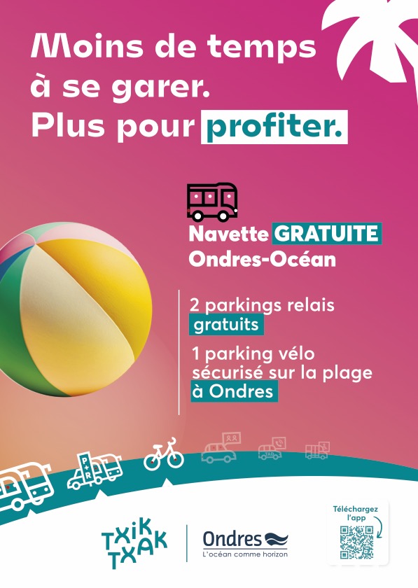 - Le nouveau parking-relais P3 (P+R) dit du « Quillet », est accessible et gratuit depuis le 8 juillet dernier (au niveau de la gare, sur l’avenue de la Plage) : environ 200 places y sont disponibles (à 2 minutes de la plage depuis le P2). Vous pouvez, toutes les 15 minutes environ, chaque après-midi, « sauter » dans la navette gratuite N20, qui vous emmènera à la plage « Ondres-Océan » ;